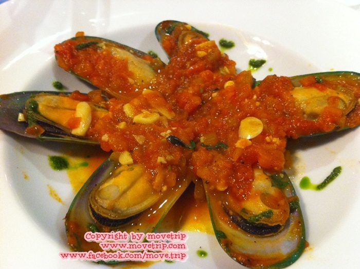หอยแมลงภู่อบกับซอสมะเขือเทศและขนมปังป่น